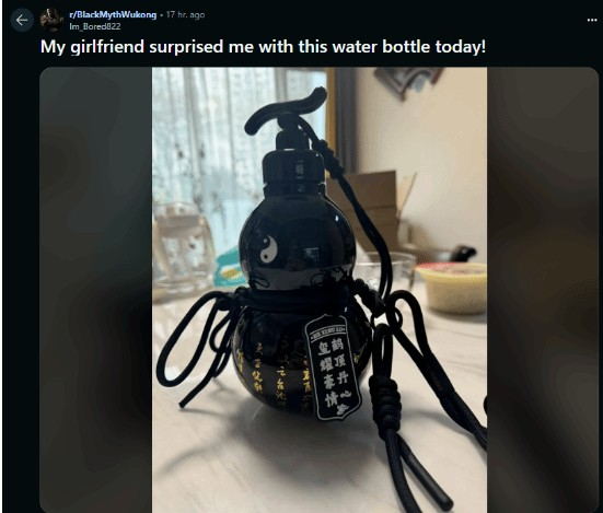 除了软萌的盲盒和精致的文创,一股“硬核中国风”也在悄然刮起。《黑神话:悟空》的爆火,游戏中的文化元素也溢出屏幕。一位国外玩家在社交平台上分享了女友送他的礼物——一只从中国购买的游戏同款葫芦水壶。帖子瞬间引爆评论区,网友们一边羡慕“这样的女友哪里找”,一边疯求购买链接。